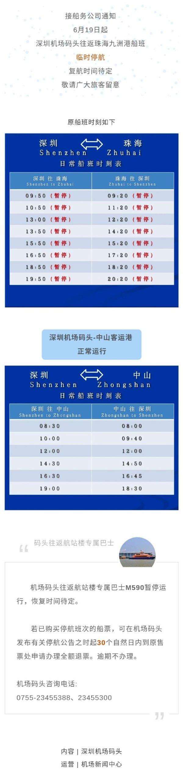 @深圳机场 消息,接船务公司通知,6月19日起,深圳机场码头往返珠海九洲港船班临时停航,复航时间待定,敬请广大旅客留意。期间,深圳机场码头往返中山港船班正常运行。服务咨询及退票详情见下图↓