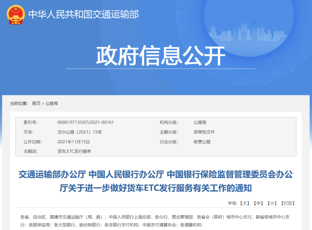 近日,交通运输部等部门印发通知,要求进一步做好货车ETC发行服务有关工作,全文如下: