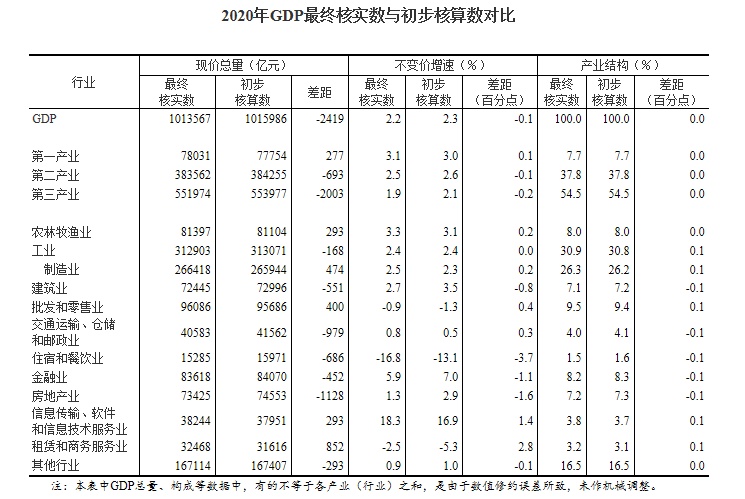 经最终核实,2020年,GDP现价总量为1013567亿元,比初步核算数减少了2419亿元;按不变价格计算,比上年增长2.2%,比初步核算数下降0.1个百分点。三次产业和各行业数据见附表。