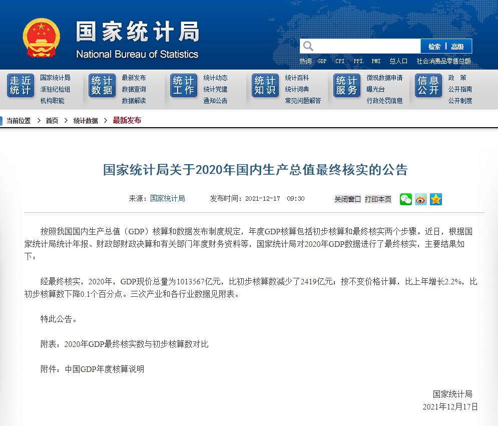 据国家统计局官网消息,按照我国国内生产总值(GDP)核算和数据发布制度规定,年度GDP核算包括初步核算和最终核实两个步骤。近日,根据国家统计局统计年报、财政部财政决算和有关部门年度财务资料等,国家统计局对2020年GDP数据进行了最终核实,主要结果如下: