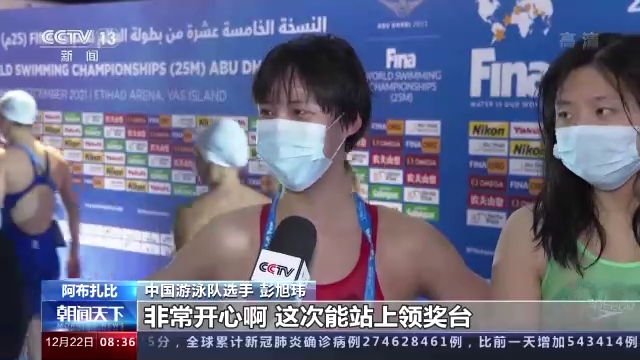 中国游泳队选手 彭旭玮:非常开心,这次能站上领奖台,非常感谢我的三位队友们,我觉得我们今天都很棒。