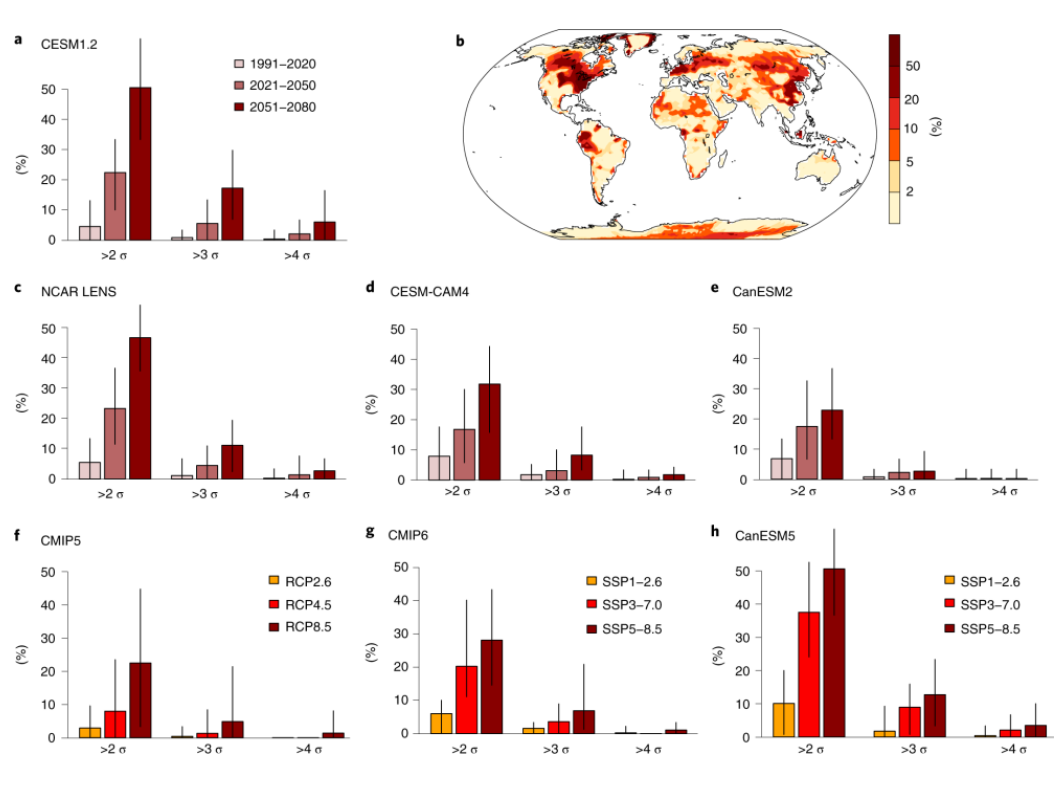 2021年的极端气候事件大大打破了长期以来的纪录。冬季风暴“乌里”袭击了北美大部,北美多地最低气温突破历史极值。在全球范围,多个国家和地区出现异常高温,北半球处在极端高温的炙烤中。瑞士研究人员2021年对破纪录热浪概率随全球变暖而变化的研究结果表明,在高排放情景下,2021-2050年破纪录极端热浪的发生概率是过去30年间的2~7倍,2051-2080年会是3~21倍。在北半球中纬度地区,2051-2080年这些事件将会每6~37年一遇。美国耶鲁大学2021年的一项研究预测,21世纪的热带气旋(飓风和台风)可能会在比过去300万年更大的纬度范围内发生,在中纬度地区可以发现更多的热带气旋。这一发现意味着热带气旋在全球变暖中会带来更高的风险。2021年在美国康涅狄格州登陆的飓风“亨利”可能是此类风暴的前兆。