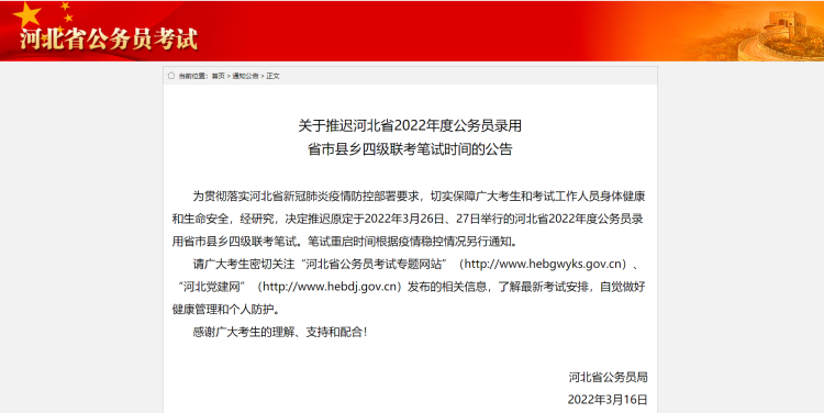 关于推迟河北省2022年度公务员录用省市县乡四级联考笔试时间的公告