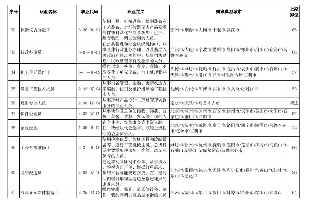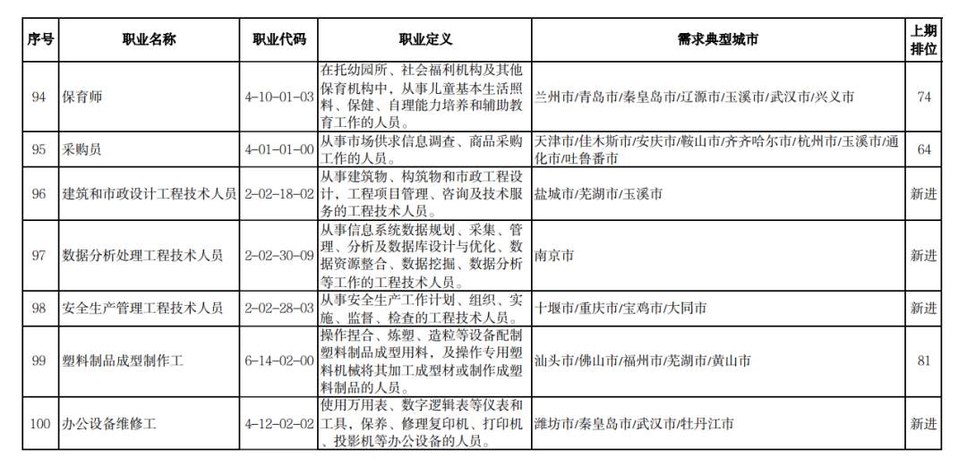 据介绍,100个职业中,36个属于第六大类——生产制造及有关人员,36个属于第四大类——社会生产服务和生活服务人员,24个属于第二大类——专业技术人员,3个属于第三大类——办事人员和有关人员,1个属于第一大类——党的机关、国家机关、群众团体和社会组织、企事业单位负责人。