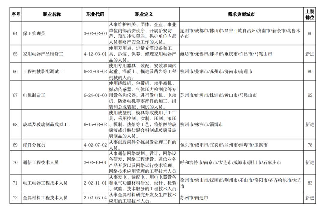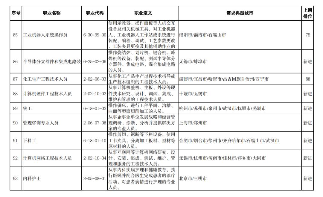 与2021年第四季度相比,招聘需求回升较慢,制造业缺工状况持续,电子信息产业需求回升明显,“通信工程技术人员”“半导体分立器件和集成电路装调工”“计算机硬件工程技术人员”“计算机网络工程技术人员”等职业新进排行,缺工程度加大。排行“前十”职业保持稳定,排位略有变化。