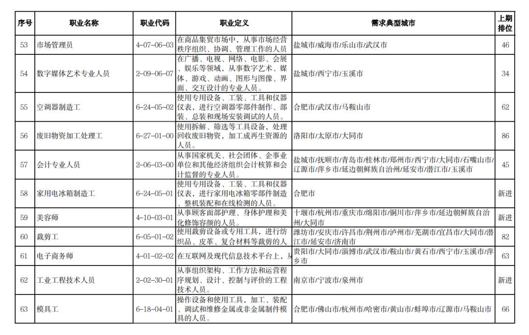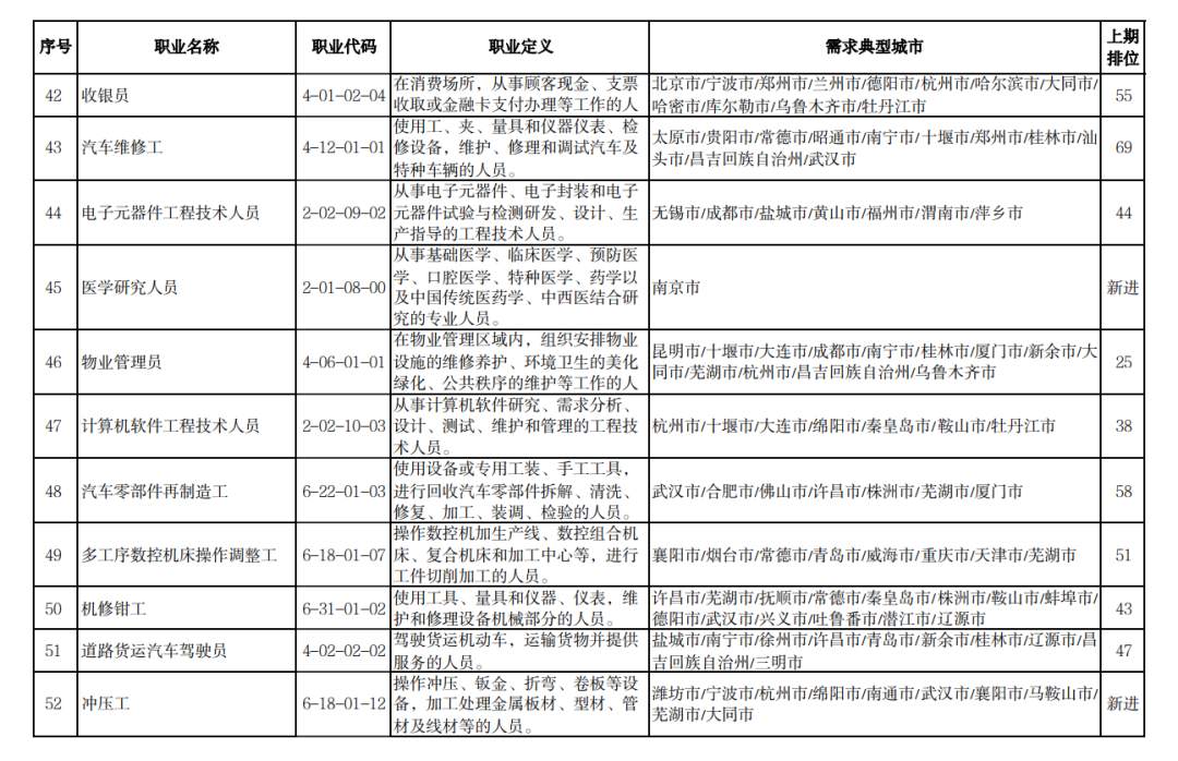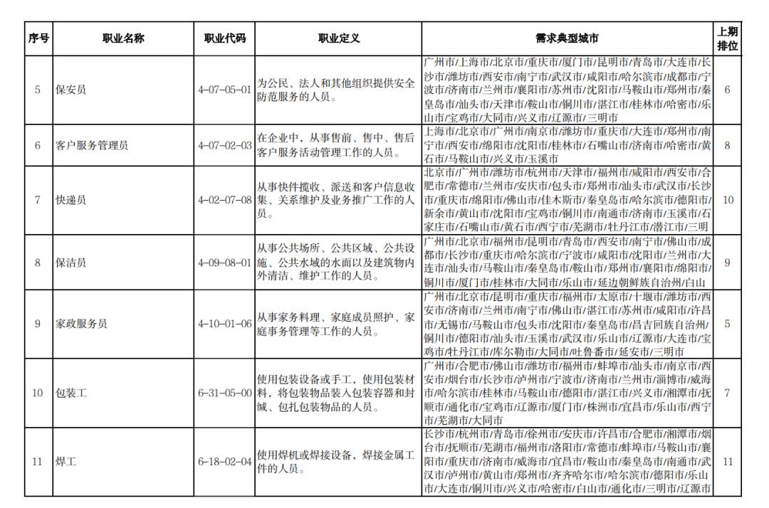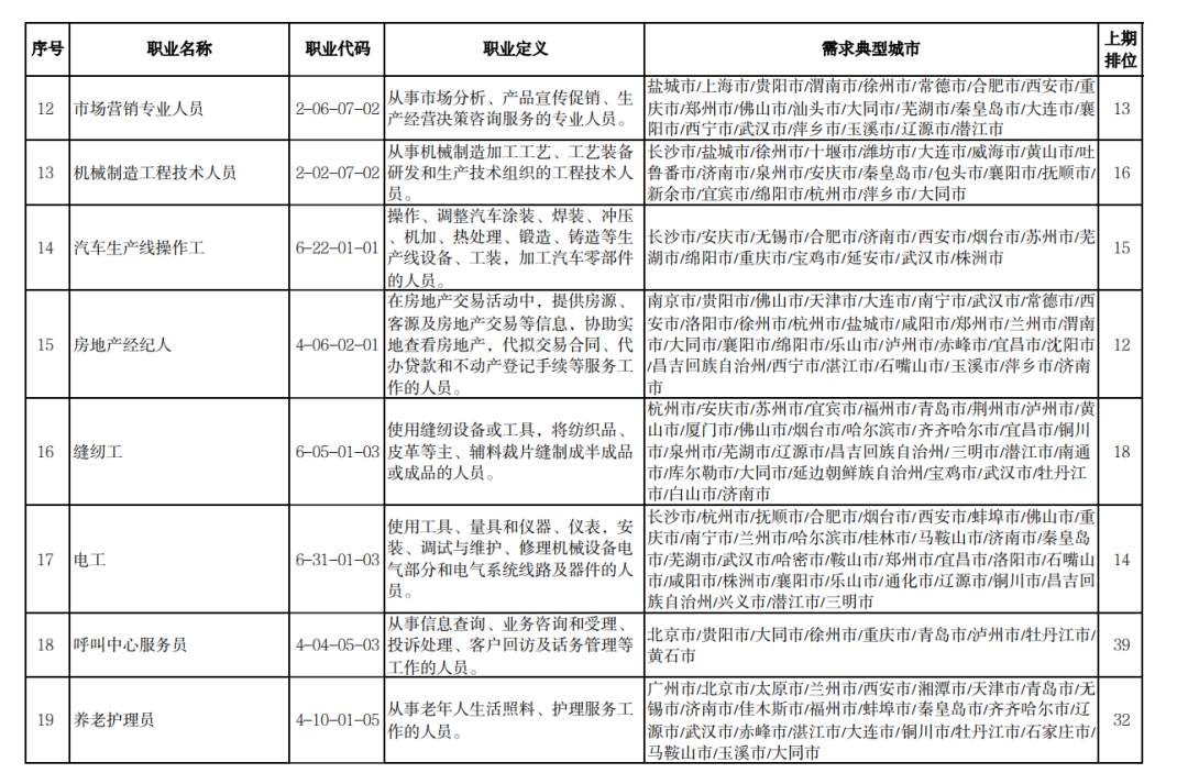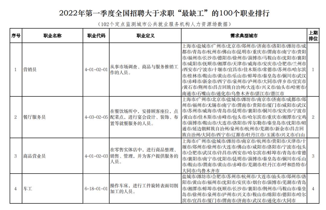 4月27日,人社部发布2022年第一季度全国招聘大于求职“最缺工”的100个职业排行。其中,营销员、餐厅服务员、商品营业员、车工、保安员、客户服务管理员、快递员、保洁员、家政服务员、包装工位列前十。