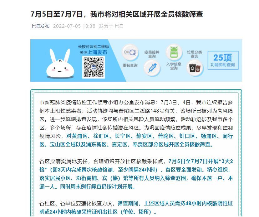 上海市新冠肺炎疫情防控工作领导小组办公室发布消息:7月3日、4日,我市连续报告多例本土阳性感染者,活动轨迹均与普陀区兰溪路148号有关,该场所已被列为高风险区。进一步流调排查发现,该场所内相关风险人员流动频繁,活动轨迹涉及我市多个区、多个场所,存在疫情社会传播潜在风险。为巩固疫情防控成果,尽早发现和控制疫情风险,对黄浦区、徐汇区、长宁区、静安区、普陀区、虹口区、杨浦区、闵行区、宝山区全域以及浦东新区、嘉定区、奉贤区部分区域开展全员核酸筛查。