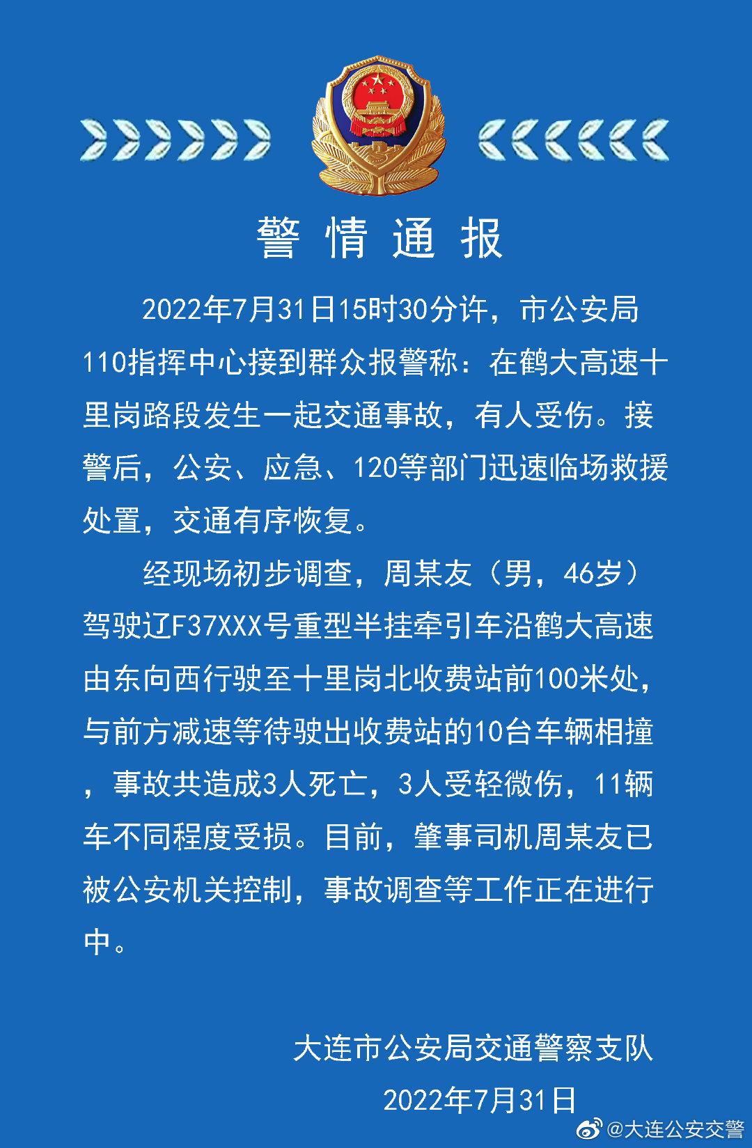 大连交警通报“鹤大高速发生多车相撞事故”:3死3伤,肇事司机已被控制