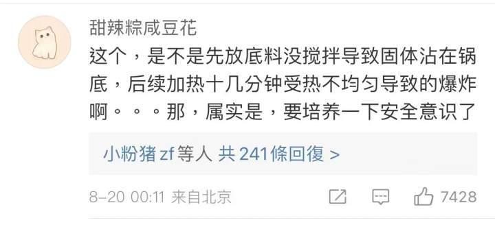 还有网友表示,这个,是不是先放底料没搅拌导致固体沾在锅底,后续加热十几分钟受热不均匀导致的爆炸啊……那,属实是,要培养一下安全意识了。