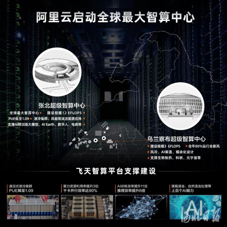 河北日报消息(记者 米彦泽)8月30日,阿里云宣布正式启动张北超级智算中心。该智算中心总建设规模为12 EFLOPS(每秒1200亿亿次浮点运算)AI算力,将超过谷歌的9 EFLOPS和特斯拉的1.8 EFLOPS,成为全球最大的智算中心,可为AI大模型训练、自动驾驶、空间地理等人工智能探索应用提供强大的智能算力服务。
