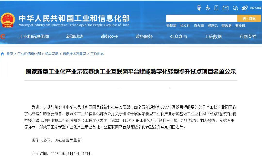 据悉,开展该项目试点工作目的是为进一步贯彻落实《中华人民共和国国民经济和社会发展第十四个五年规划和2035年远景目标纲要》关于“加快产业园区数字化改造”的重要部署。按照《工业和信息化部办公厅关于组织开展国家新型工业化产业示范基地工业互联网平台赋能数字化转型提升试点项目申报工作的通知》的工作安排,经自主申报、地方推荐、材料核查、专家评审等环节,形成了国家新型工业化产业示范基地工业互联网平台赋能数字化转型提升试点项目名单。