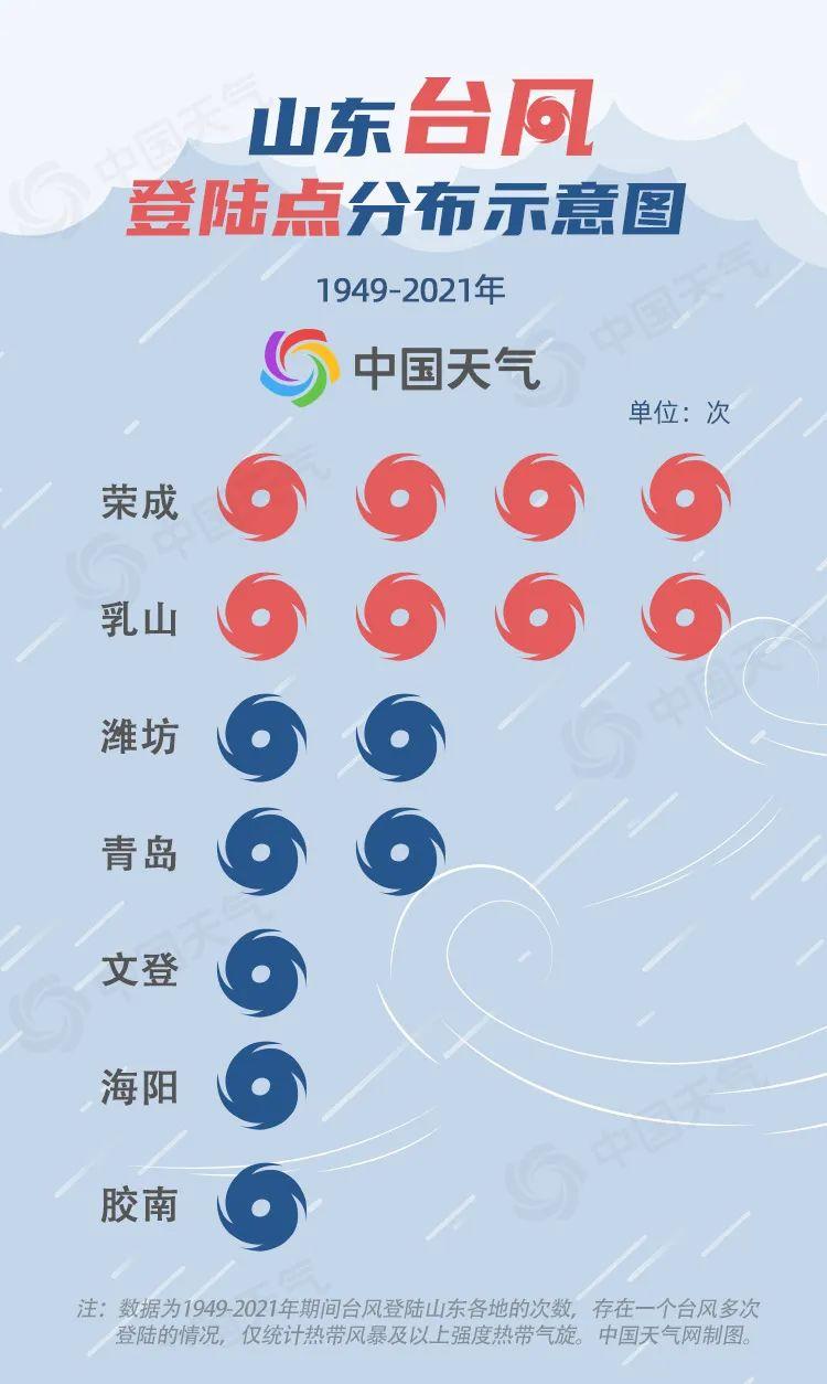 中国天气网盘点大数据发现,台风在山东的登陆地点主要集中在山东半岛南部沿海地区,占比高达87%。其中,荣成和乳山是台风登陆次数最多的地方,达到了4次,青岛和潍坊以2次并列第二,海阳、文登、胶南各有1次。