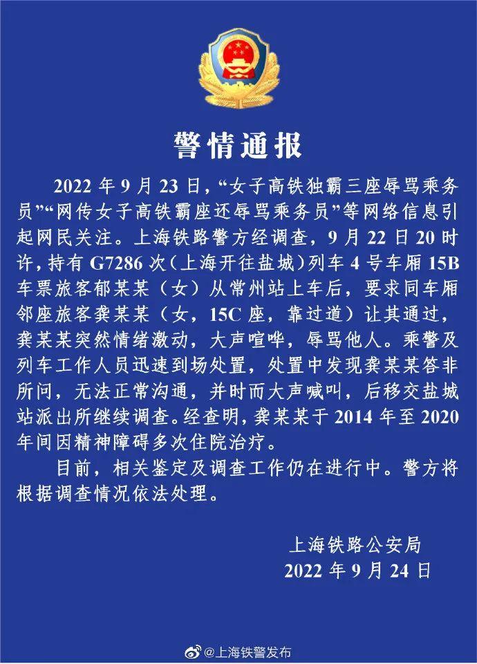 9月24日,上海铁路公安局发布通报,回应网传“女子高铁独霸三座辱骂乘务员”事件。
