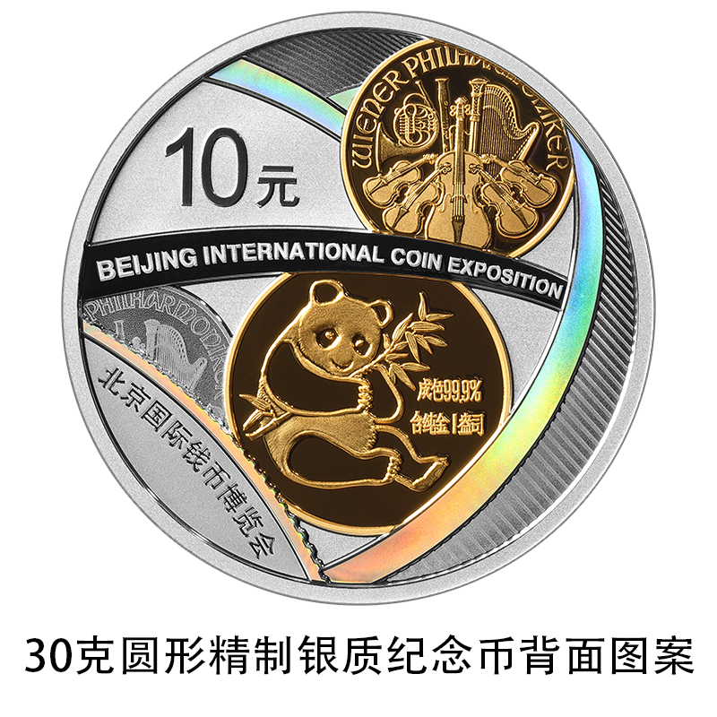 该银质纪念币背面图案为中国熊猫金币图案和奥地利维也纳爱乐乐团金币图案,结合钱币图形元素组合设计,并刊“北京国际钱币博览会”中文字样、“BEIJING INTERNATIONAL COIN EXPOSITION”英文字样及面额。