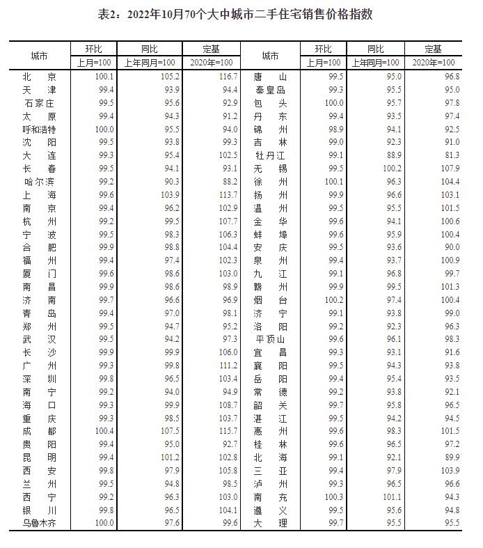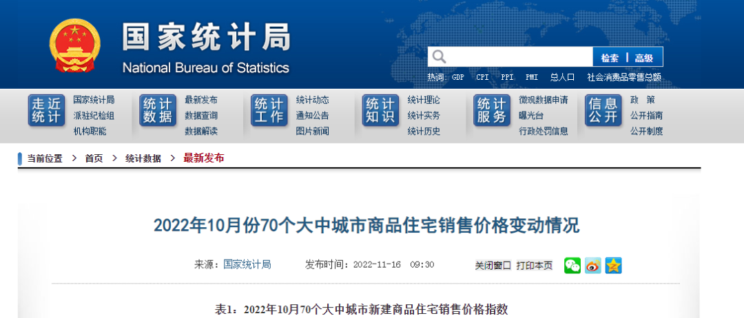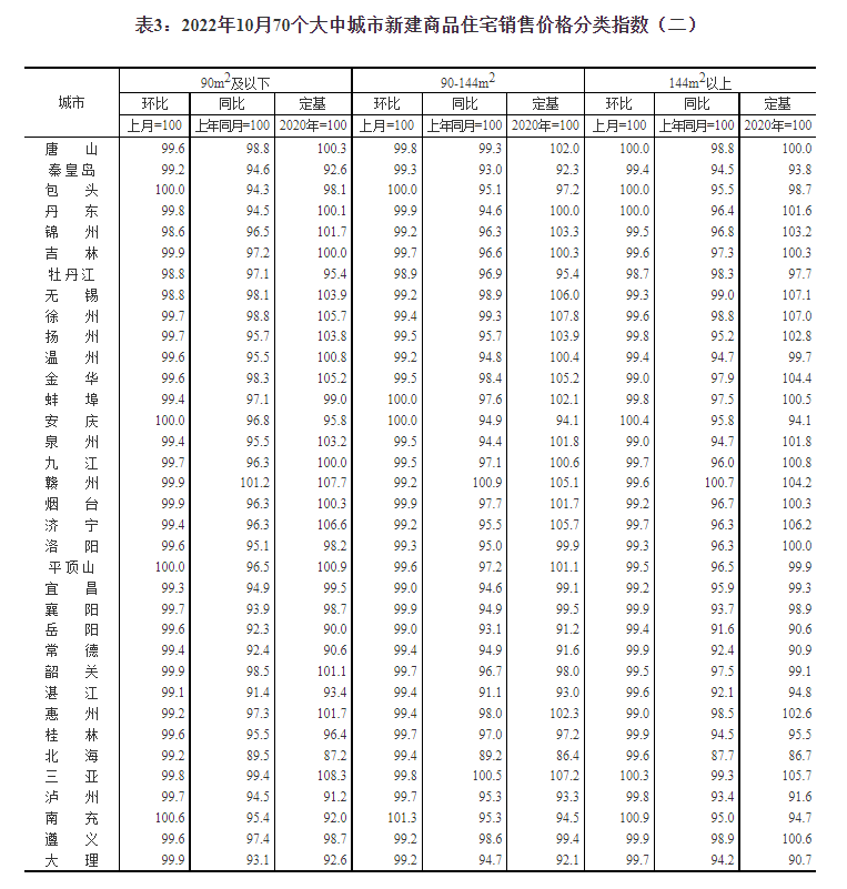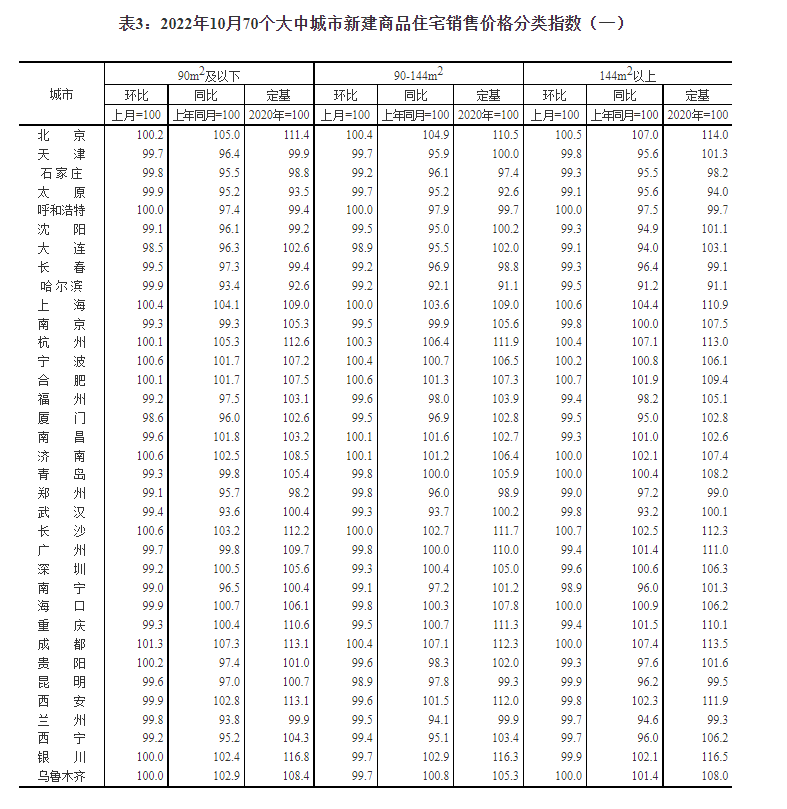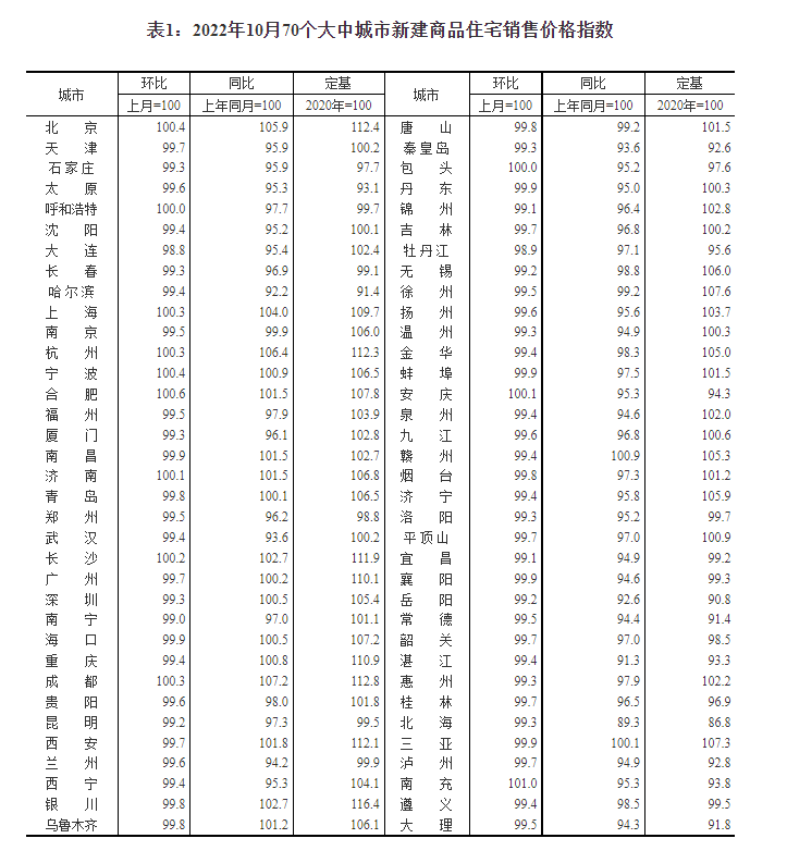 国家统计局今日发布10月份商品住宅销售价格变动情况统计数据。数据显示,10月份,70个大中城市中商品住宅销售价格下降城市个数增加,一线城市新建商品住宅销售价格同比上涨2.6%,涨幅比上月回落0.1个百分点。