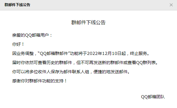 据公告,因业务调整,“QQ邮箱群邮件”功能将于2022年12月10日起,终止服务。届时用户依然可查看历史的群邮件,但不可再发送新的群邮件或查看QQ群列表。