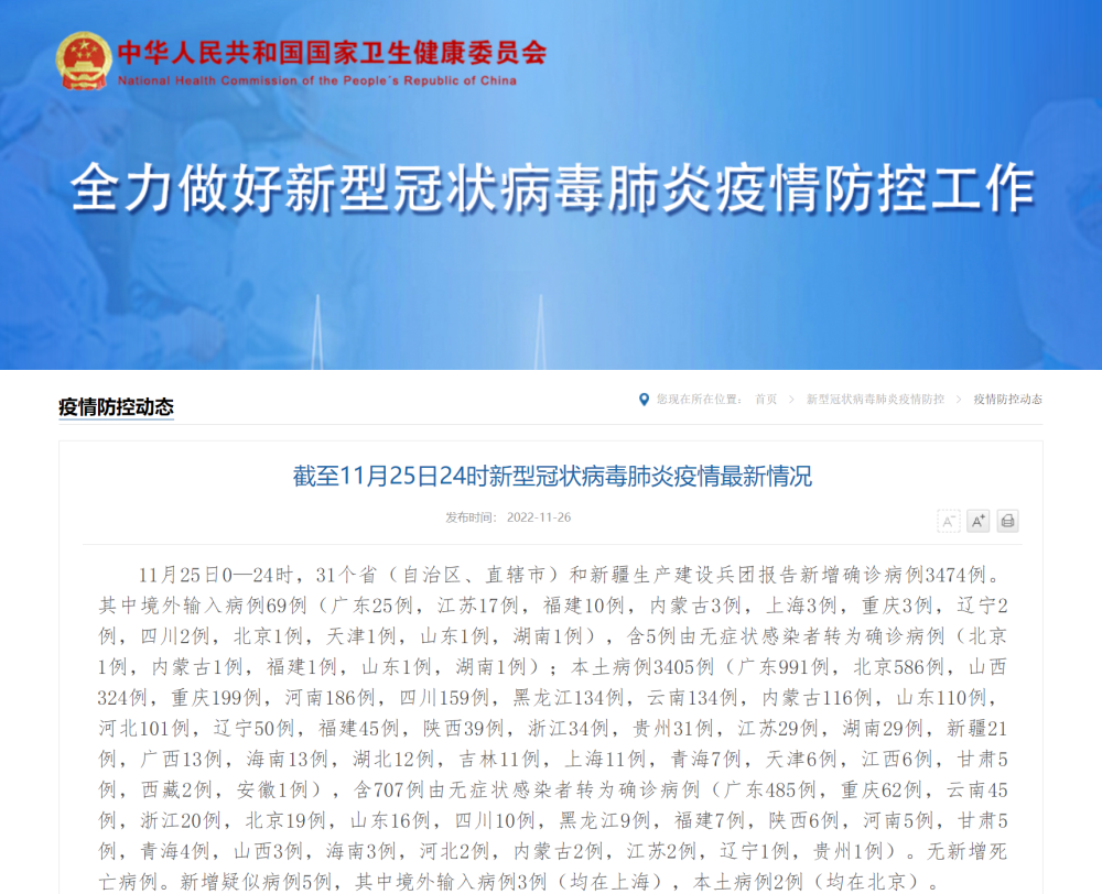 11月25日0—24时,31个省(自治区、直辖市)和新疆生产建设兵团报告新增确诊病例3474例。其中境外输入病例69例(广东25例,江苏17例,福建10例,内蒙古3例,上海3例,重庆3例,辽宁2例,四川2例,北京1例,天津1例,山东1例,湖南1例),含5例由无症状感染者转为确诊病例(北京1例,内蒙古1例,福建1例,山东1例,湖南1例);本土病例3405例(广东991例,北京586例,山西324例,重庆199例,河南186例,四川159例,黑龙江134例,云南134例,内蒙古116例,山东110例,河北101例,辽宁50例,福建45例,陕西39例,浙江34例,贵州31例,江苏29例,湖南29例,新疆21例,广西13例,海南13例,湖北12例,吉林11例,上海11例,青海7例,天津6例,江西6例,甘肃5例,西藏2例,安徽1例),含707例由无症状感染者转为确诊病例(广东485例,重庆62例,云南45例,浙江20例,北京19例,山东16例,四川10例,黑龙江9例,福建7例,陕西6例,河南5例,甘肃5例,青海4例,山西3例,海南3例,河北2例,内蒙古2例,江苏2例,辽宁1例,贵州1例)。无新增死亡病例。新增疑似病例5例,其中境外输入病例3例(均在上海),本土病例2例(均在北京)。