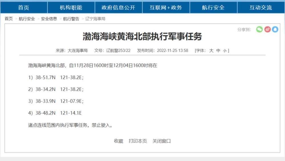 大连海事局发布航行警告,11月28日16时至12月4日16时,渤海海峡黄海北部部分海域执行军事任务,禁止驶入。
