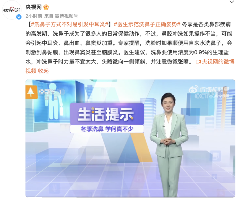 【洗鼻子方式不对易引发中耳炎】冬季是各类鼻部疾病的高发期,洗鼻子成为了很多人的日常保健动作,不过,鼻腔冲洗如果操作不当,可能会引起中耳炎、鼻出血、鼻窦炎加重。专家提醒,洗脸时如果顺便用自来水洗鼻子,会刺激到鼻黏膜,出现鼻窦炎甚至脑膜炎。医生建议,洗鼻要使用浓度为0.9%的生理盐水,冲洗鼻子时力量不宜太大,头略微向一侧倾斜,并注意微微张嘴。