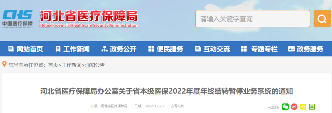 河北省医疗保障局办公室关于省本级医保2022年度年终结转暂停业务系统的通知