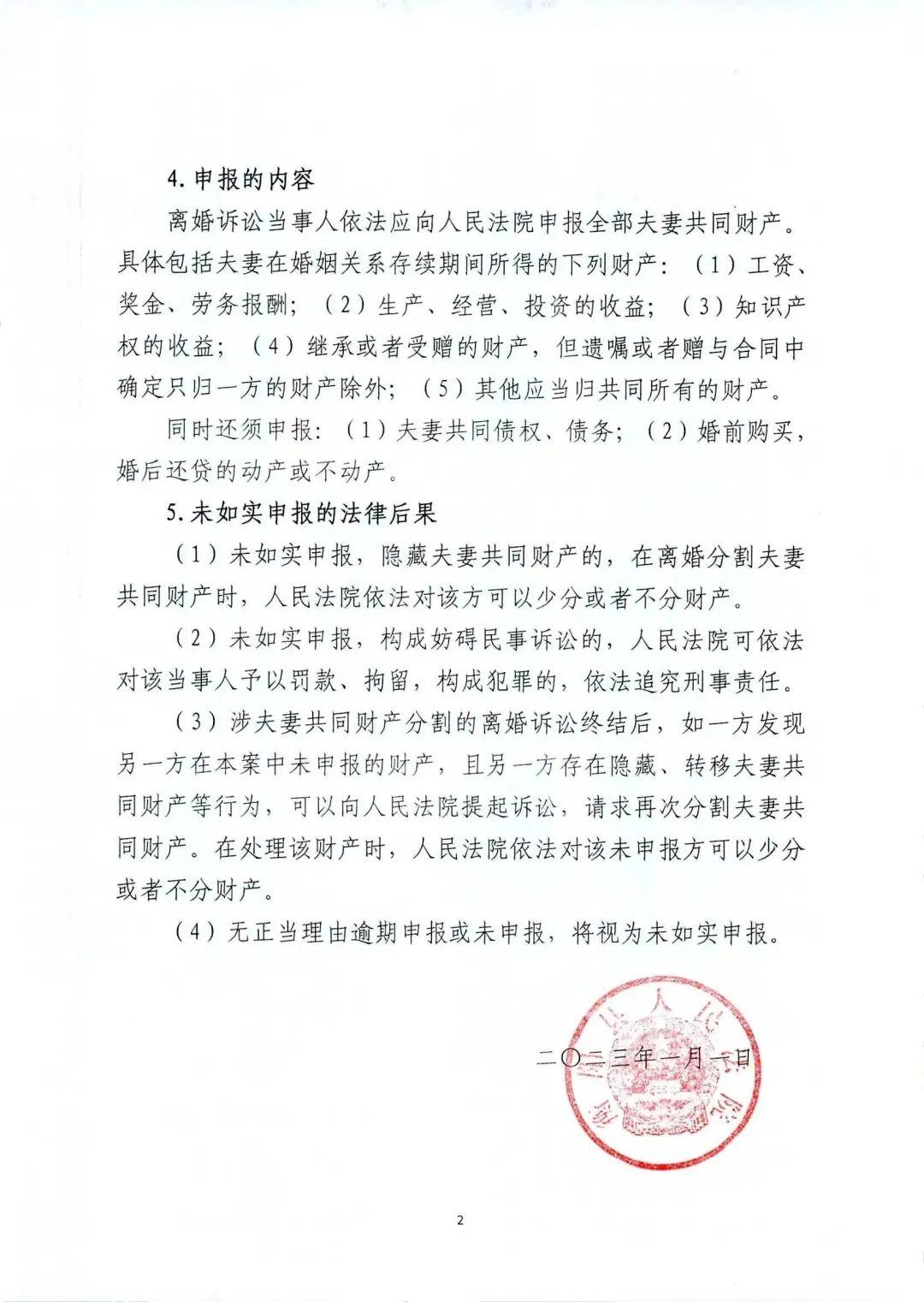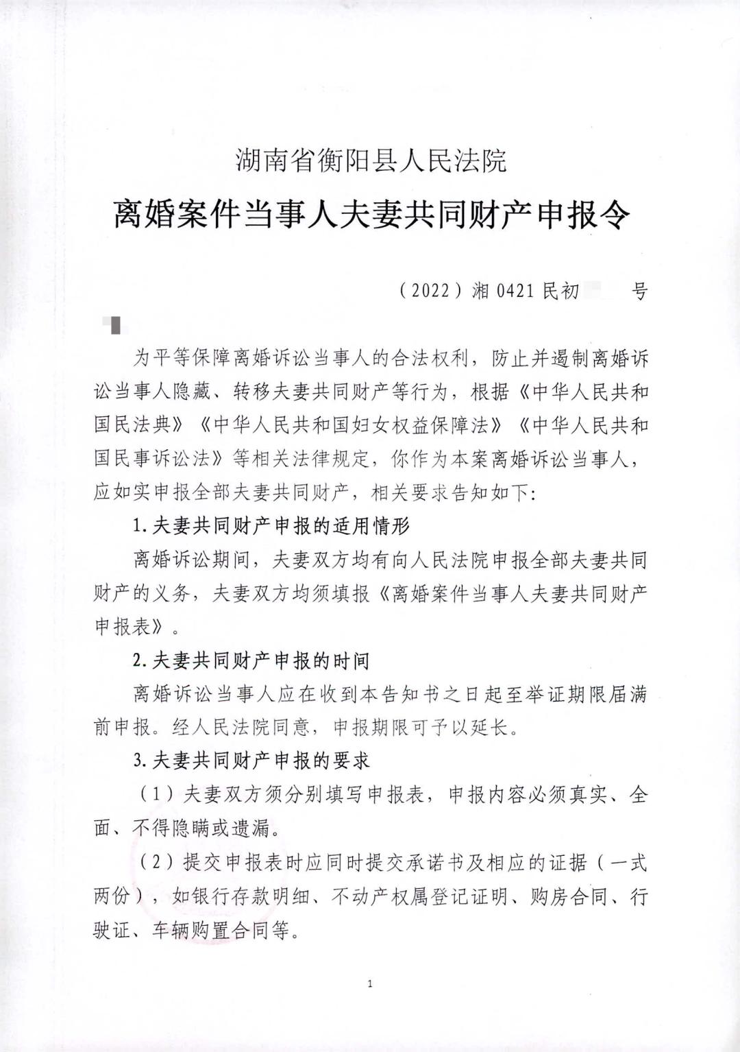 2023年1月1日,湖南省衡阳县人民法院向一起离婚纠纷案件双方当事人发出《离婚案件当事人夫妻共同财产申报令》。这是新修订的《中华人民共和国妇女权益保障法》正式施行后的全国首份《夫妻共同财产申报令》。
