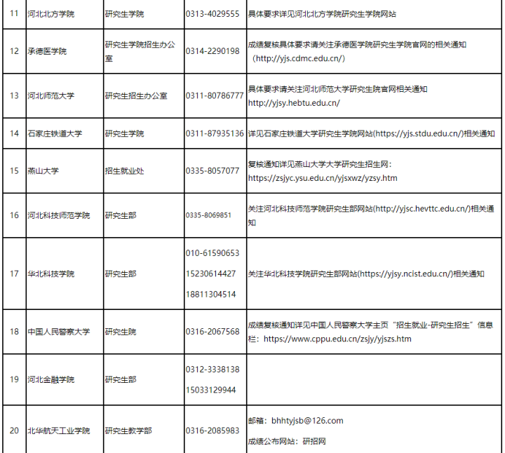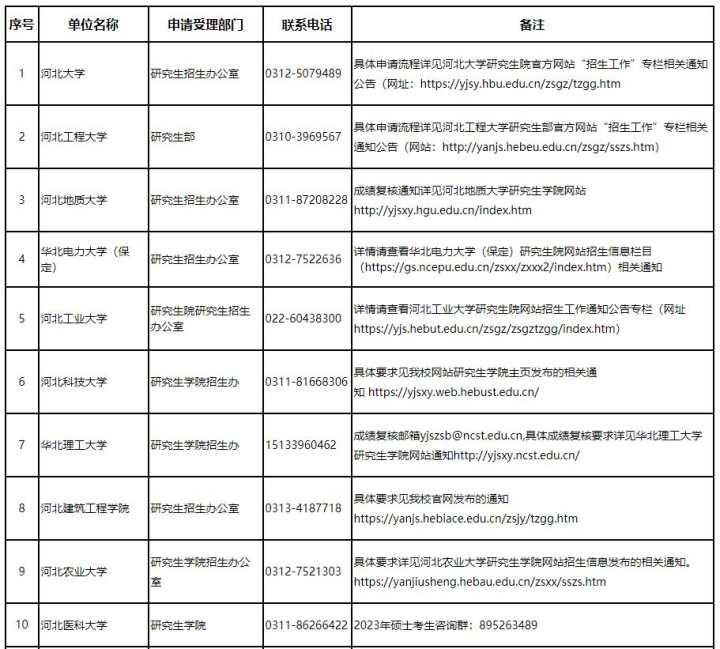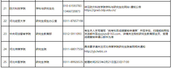 附:河北省2023年全国硕士研究生招生考试(初试)各招生单位成绩复核申请工作联系方式