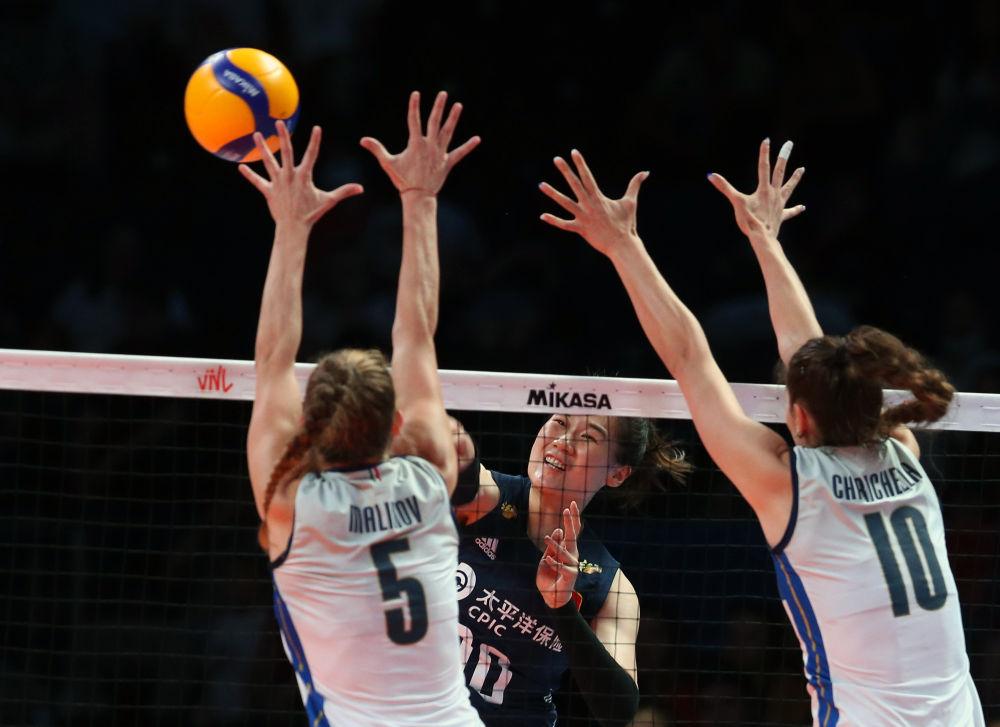 2022年6月4日,中国队球员王云蕗(中)在土耳其安卡拉举行的2022年世界女排联赛分站赛中扣球。新华社发(穆斯塔法·卡亚摄)