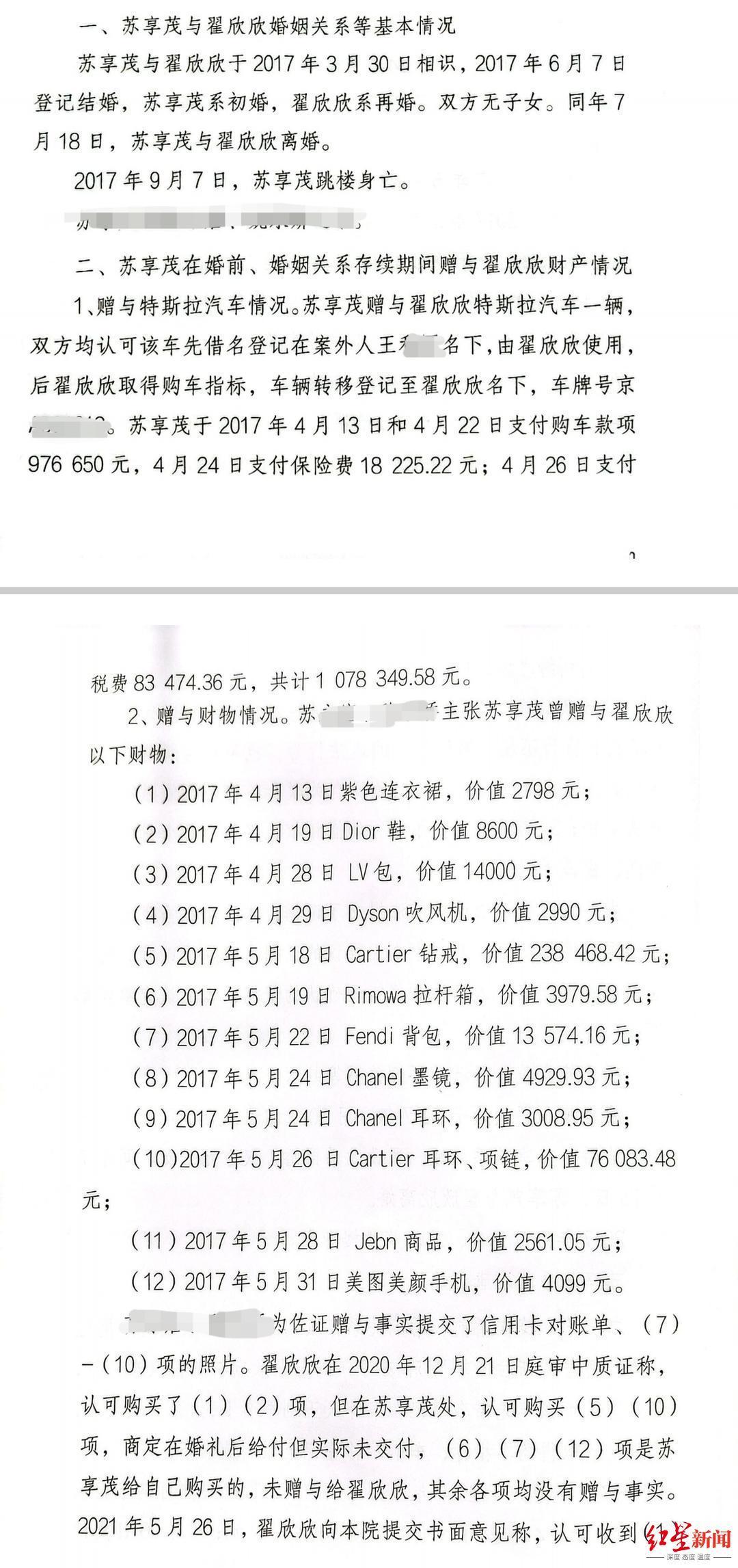 根据此份判决,翟欣欣需退还苏享茂家属价值约108万元的特斯拉汽车一辆;退还价值30余万的卡蒂尔钻戒和项链;退还转账共计186万余元。