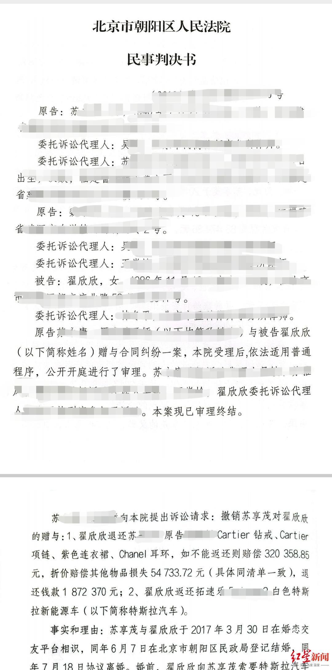 2023年4月5日,记者获悉,本案于3月31日在北京市朝阳区人民法院宣判,一审判决翟欣欣退还苏享茂家属现金、汽车共近千万以及撤销翟欣欣海南、北京两套房产的个人所有权。