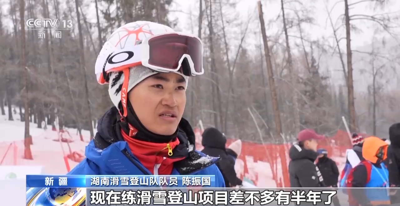 湖南滑雪登山队队员 陈振国:现在练滑雪登山项目差不多有半年了,我觉得首先这个场地非常好,雪质也非常好,因为今天刚好也下雪,给我们赛道也增加了一点难度。