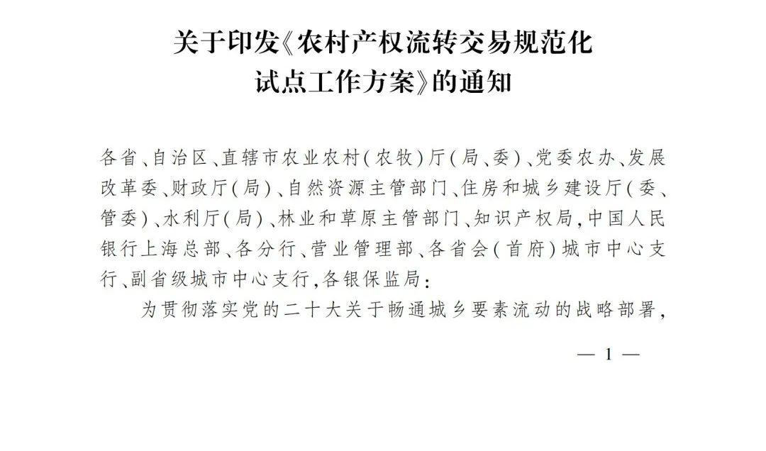 为贯彻落实党的二十大关于畅通城乡要素流动的战略部署,贯彻落实近年中央一号文件精神、《中共中央、国务院关于稳步推进农村集体产权制度政革的意见》和《国务院办公厅关于引导农村产权流转交易市场健康发展的意见》要求,现印发《农村产权流转交易规范化试点工作方案》,请结合实际认真组织实施。