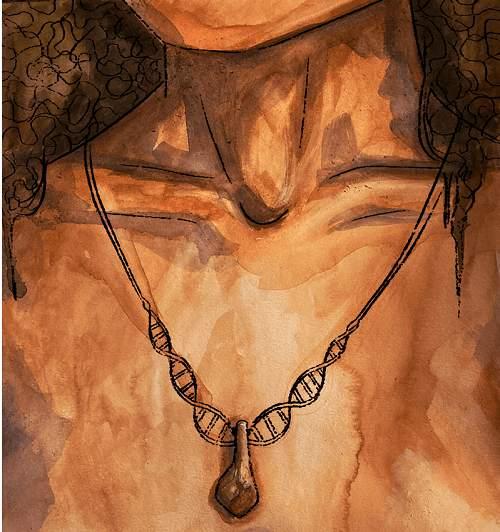 坠饰艺术再现图,图中吊坠绳为DNA螺旋样式。图片来源:Myrthe·Lucas/《自然》