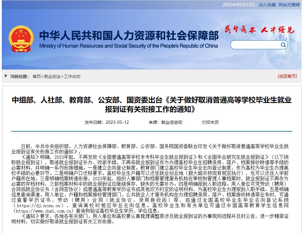 日前,中共中央组织部、人力资源社会保障部、教育部、公安部、国务院国资委联合印发《关于做好取消普通高等学校毕业生就业报到证有关衔接工作的通知》。
