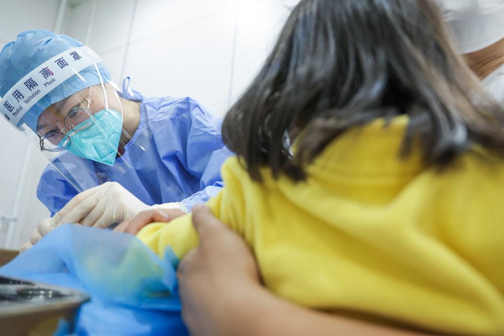 5月9日22时许,北京协和医院急诊科发热门诊护士姜迪为一个儿童采指血。新华社记者 张玉薇 摄
