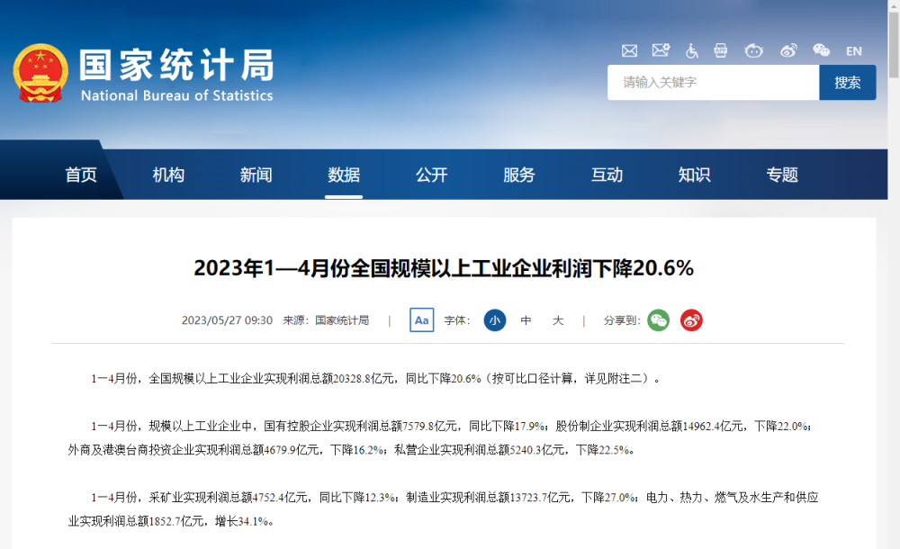 1—4月份,全国规模以上工业企业实现利润总额20328.8亿元,同比下降20.6%。