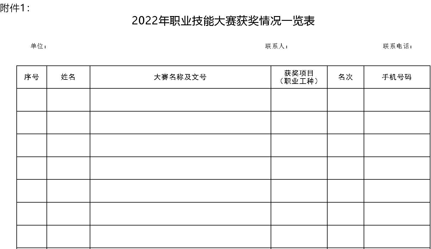 请各单位重视,指定专人负责,认真填写2022年职业技能大赛获奖情况统计表,连同相关资料一并于2023年6月20日前将电子版发职业能力建设处邮箱:tszynljsc@163.com,逾期不再受理。