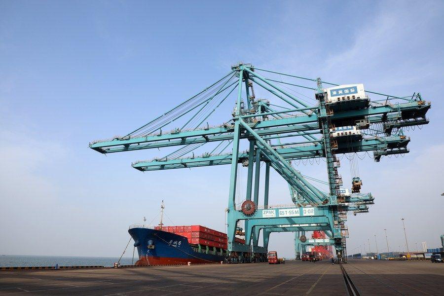 3月9日,船舶停靠在黄骅港综合港区集装箱码头进行卸船作业。新华社记者 骆学峰 摄