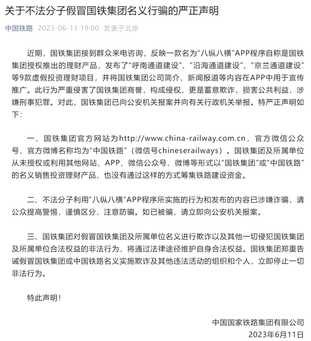 近期,国铁集团接到群众来电咨询,反映一款名为“八纵八横”APP程序自称是国铁集团授权推出的理财产品,发布了“呼南通道建设”、“沿海通道建设”、“京兰通道建设”等9款虚假投资理财项目,并将国铁集团公司简介、新闻报道等内容在APP中用于宣传推广。此行为严重侵害了国铁集团商誉,构成侵权,更是蓄意欺诈,损害公共利益,涉嫌刑事犯罪。对此,国铁集团已向公安机关报案并向有关行政机关举报。特严正声明如下: