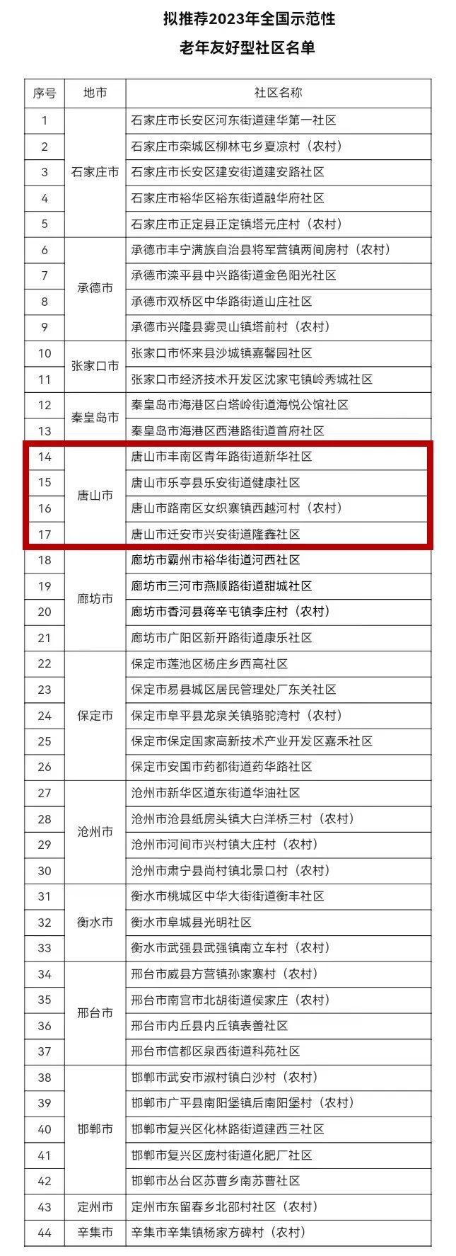 6月26日,河北省卫生健康委员会、河北省老龄工作委员会办公室发布了“关于2023年全国示范性老年友好型社区拟推荐名单的公示”,名单显示唐山4社区入选,详情如下: