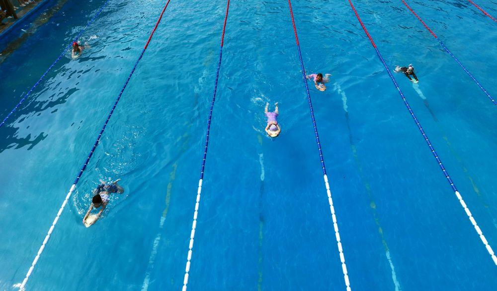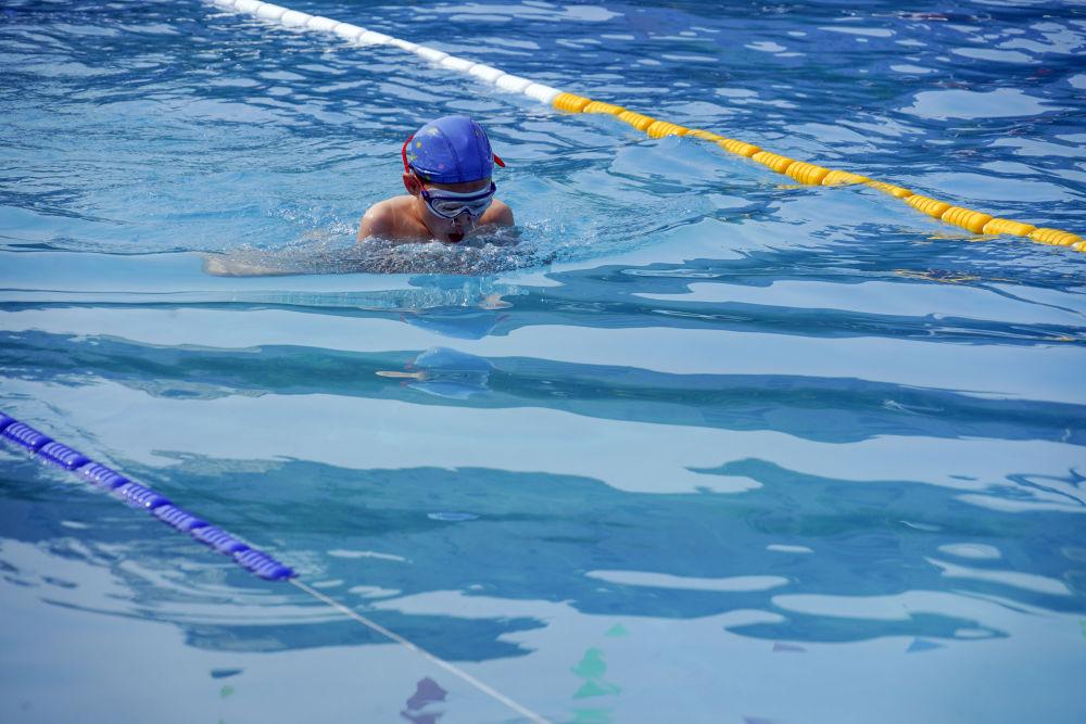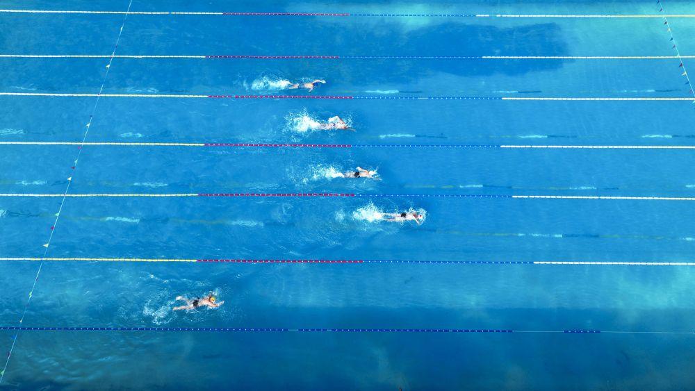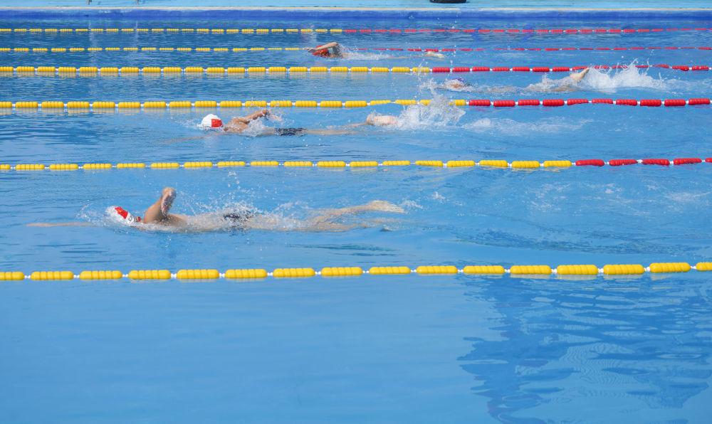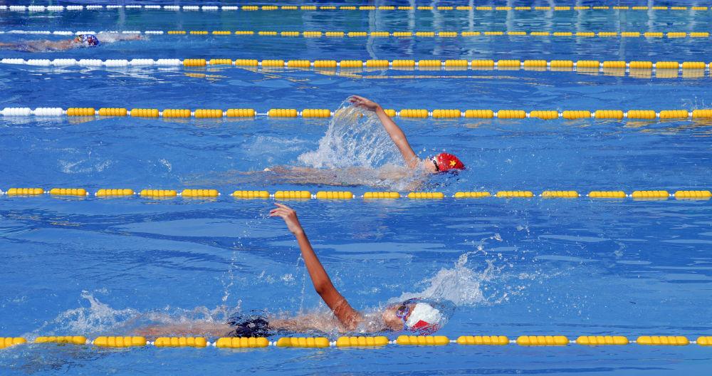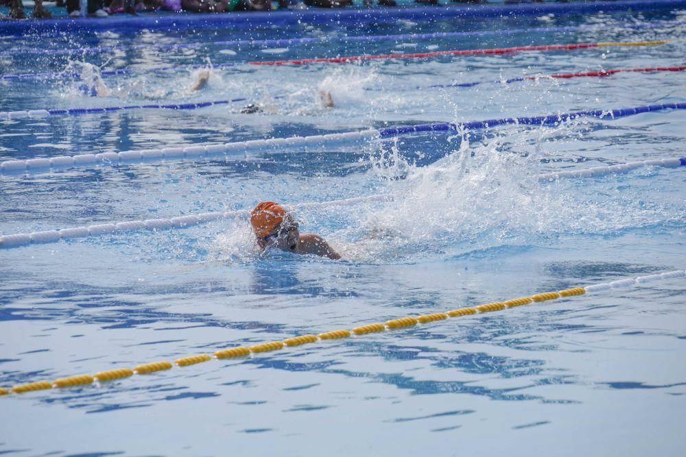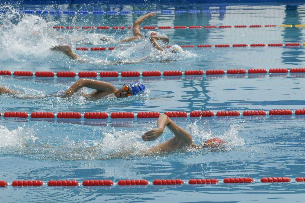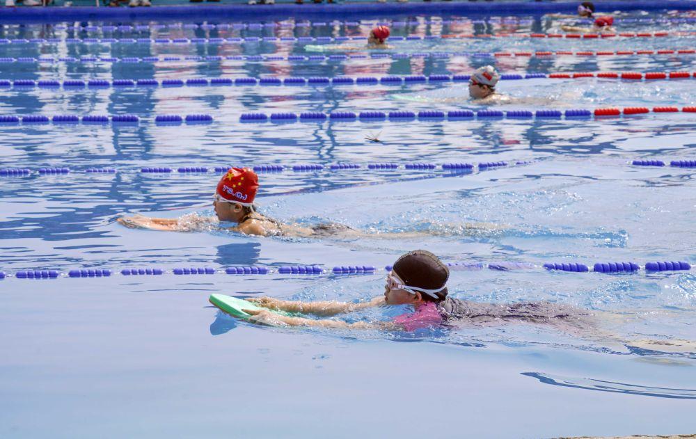 ↑8月9日,唐山遵化市举办游泳比赛,参赛选手你追我赶,比赛现场紧张激烈。刘满仓 摄