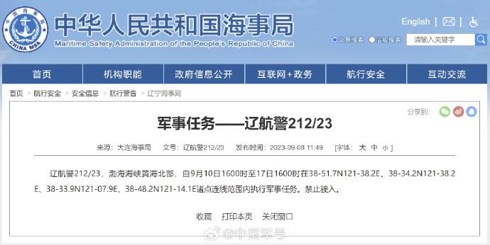 据中国海事局网站消息,大连海事局发布航行警告,9月10日16时至17日16时,渤海海峡黄海北部执行军事任务,禁止驶入。