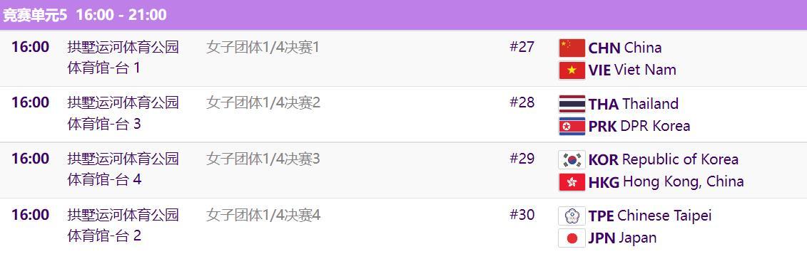 24日,杭州亚运会乒乓球女团1/8决赛结束,8强名单出炉。中国队在1/8决赛轮空,直接晋级,其他进入8强的球队有越南、泰国、朝鲜、韩国、中国香港、中国台北、日本。杭州亚运会乒乓球女团1/4决赛将在24日下午进行,中国队对阵越南队。