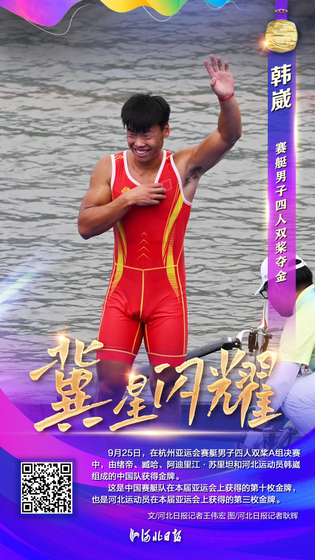 河北日报客户端9月25日消息(记者 王伟宏)在刚刚结束的杭州亚运会赛艇男子四人双桨A组决赛中,由绪帝、臧哈、阿迪里江·苏里坦和河北运动员韩崴组成的中国队以明显优势获得金牌。这是中国赛艇队在本届亚运会上获得的第十枚金牌,也是河北运动员在本届亚运会上获得的第三枚金牌。