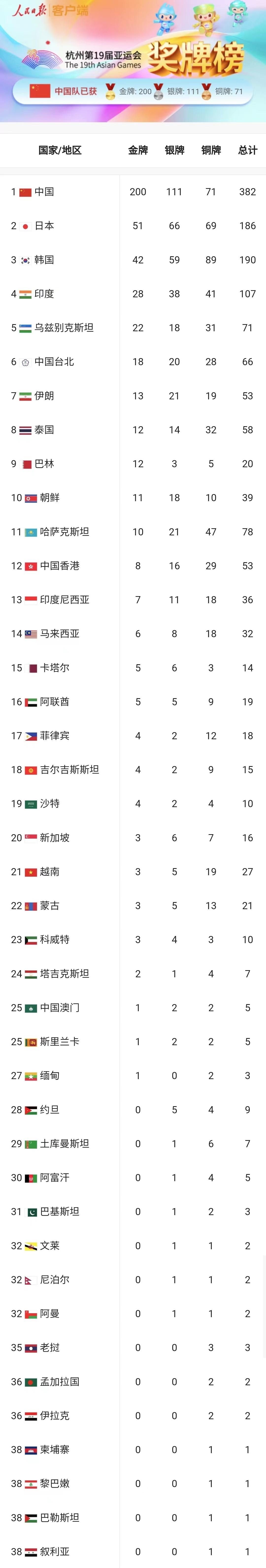中国队已获得200金111银71铜