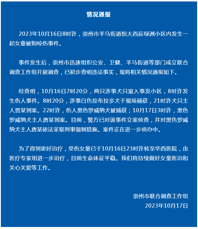 10月17日,四川崇州市联合调查工作组通报女童被狗咬伤事件。当地警方已对该事件立案侦查,并对黑色罗威纳犬主人唐某依法采取刑事强制措施。