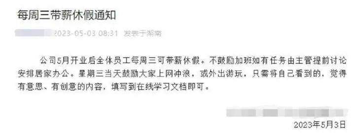 2023年4月,湖南长沙一传媒公司在其官方公众号发布消息称,全体员工每周三可带薪休假一天,鼓励公司员工每周三上网或外出游玩,且不提倡加班。这家公司的名字就叫“周三也休”文化传媒有限公司。