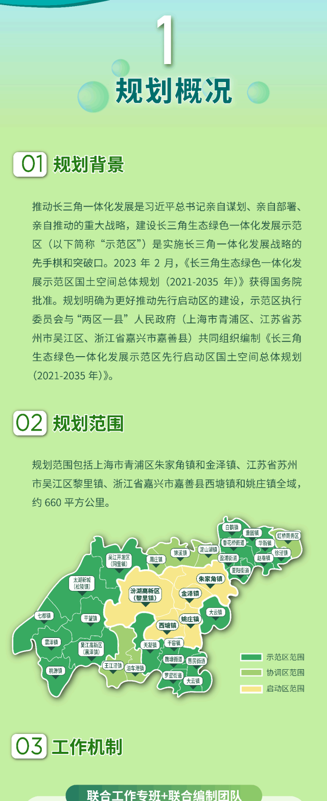 长三角一体化示范区执委会介绍,近日,《长三角生态绿色一体化发展示范区先行启动区国土空间总体规划(2021-2035年)》获得沪苏浙两省一市人民政府联合批复,这标志着示范区“1+1+N+X”跨省域法定国土空间规划管理体系构建成型(第一个“1”即示范区国土空间总体规划,第二个“1”即先行启动区国土空间总体规划,“N”即多个重点领域专项规划,“X”即若干详细规划)。详见↓