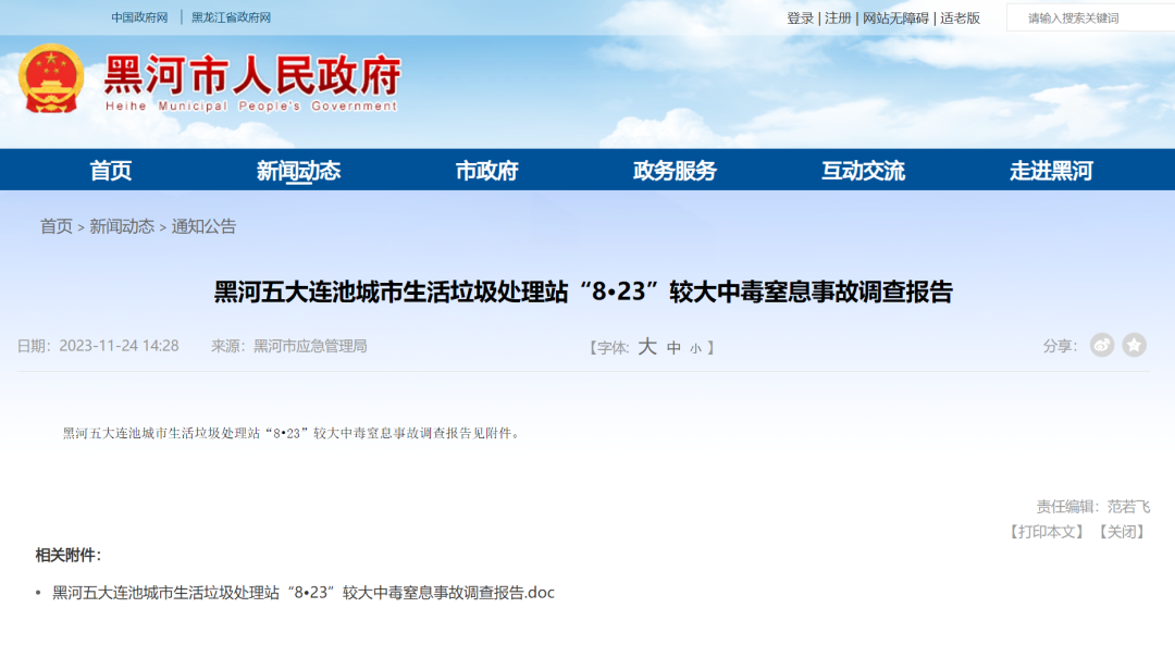 经调查认定,黑河五大连池城市生活垃圾处理站“8·23”较大中毒窒息事故是一起因从业人员安全意识淡薄、违规作业、盲目施救,企业主体责任不落实,部门安全监管不到位而导致的较大生产安全责任事故。