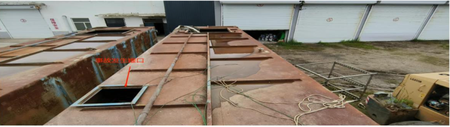 事故储罐为长12.7米、宽2.5米,高2.5米 ,容积100立方米的长方形箱式储罐。储罐顶部有2个0.5米的正方形小罐口、1个1.3米的正方形大罐口。