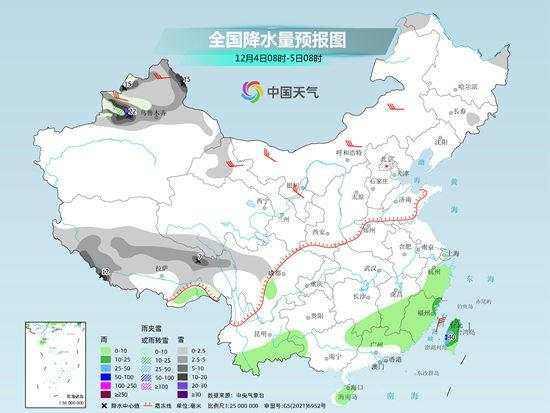 具体来看,中央气象台预计,今天,新疆北部、甘肃河西、青海南部、西藏中东部和南部、川西高原北部等地部分地区有小到中雪或雨夹雪,其中,新疆阿勒泰山区和伊犁河谷、西藏南部等地部分地区有大到暴雪,局地大暴雪。湖南南部、江西南部、浙江大部、福建、广东东部和北部、广西西部、云南南部、海南岛、台湾岛等地部分地区有小到中雨,其中,台湾岛中南部等地部分地区有大雨。